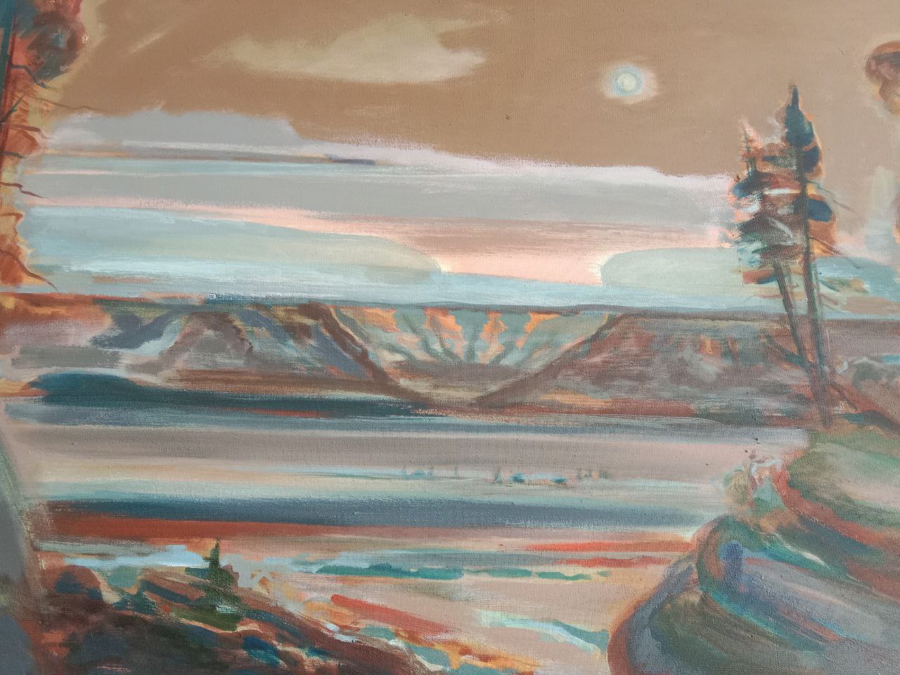 И ещё один пример, «Над лесами, над горами» – необычные краски неба в конце заката, занимающие значительную часть полотна, геометрически округлые валуны, формы крон у деревьев – во всём узнаётся кисть Владимира Шаповалова. Анатолий Разуев поясняет сходство на более глубоких приметах, анализирует как художник изображает отражения в воде, какими цветными линиями он выстраивает линию берега и т.д.