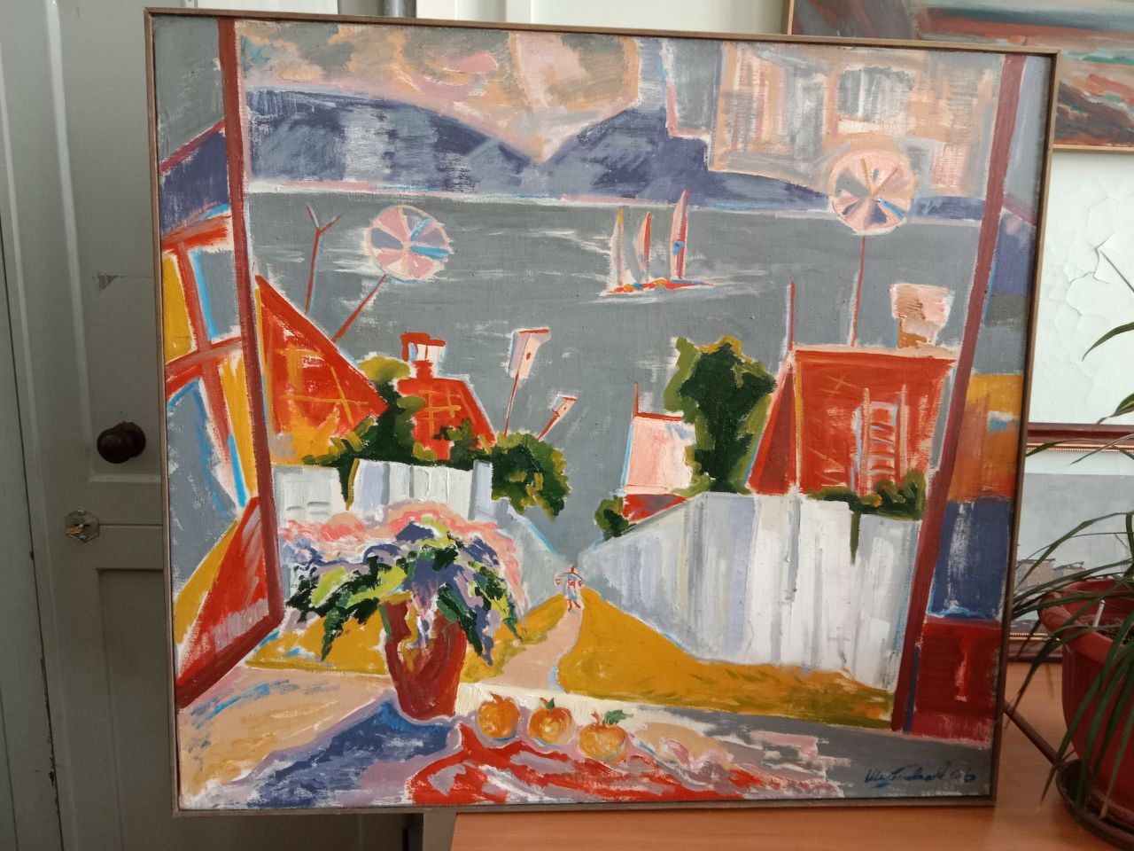 В конце беседы Анатолий Разуев показал три полотна (см. фото) нашего земляка, художника Владимира Шаповалова, написанные примерно двадцать лет назад. Две из них – картины на один и тот же сюжет «У озера Тургояк» и «Мансарда художника». Стекла похожи на витражи, занавески сливаются с небом. На подоконнике букет и фрукты, из окна панорама водной глади, к ней спускается улица, круглые флюгеры на крышах, заборы и скворечники, женщина с коромыслом, по озеру скользят парусники, вдали силуэты гор. Но какие разные полотна! Одно передаёт свежесть и движение ветра, солнце на нём в зените, озеро ожидает бури, и стальной цвет воды как будто создает вызов ярким краскам, которыми выписаны стены домов, цветы, кроны… Другое скорее отражает тихий вечер, водная гладь становится светлее и умиротвореннее, сумерки постепенно скрадывают краски внутри мансарды…