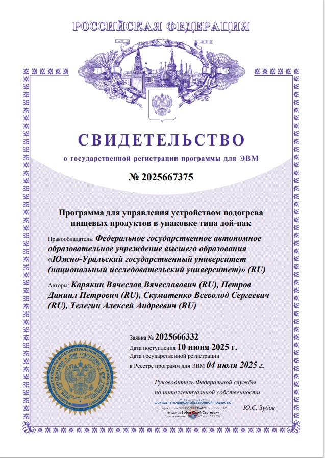 Исследование коллектива студентов кафедры «Радиоэлектроника и системы связи» ВШЭиКН ЮУрГУ, посвященное изготовлению уникального нагревателя пищевых продуктов, выходит на завершающий этап. 4 июля 2025 года команда студентов получила Свидетельство о государственной регистрации программы для ЭВМ № 2025667375, что дает коллективу право распоряжаться своей интеллектуальной собственностью.