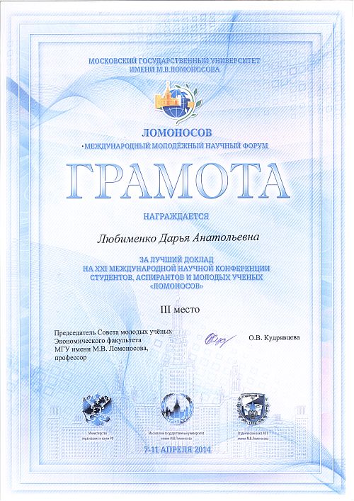 Любименко Дарья успешно выступила с докладом «Применение концепции социологии вещей для объяснения ряда тенденций потребительского поведения» и заняла III место. Дарья – студентка второго курса – вошла в тройку лидеров наряду с более опытными «соперниками» – магистрантами МГУ. Это позволяет оценить ее выступление как безоговорочный успех, который по праву разделяет и ее научный руководитель доцент, к.э.н. Виктория Олеговна Боос.