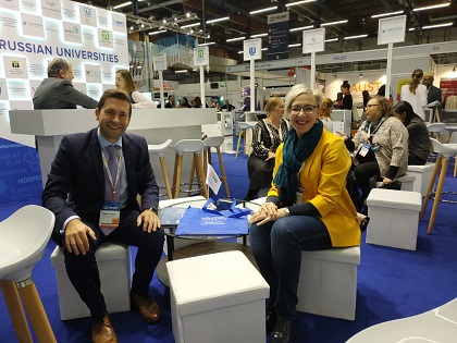 В ходе выставки EAIE 2019 представители ЮУрГУ проводят серию встреч, направленных на укрепление уже существующих связей и поиск новых партнеров для обсуждения перспективных направлений сотрудничества. Ольга Ярошенко и Людмила Лапина знакомят гостей выставки с университетом в рамках работы объединенного стенда Проекта 5-100 и на встречах в формате В2В («Business to business») с представителями других стран.
