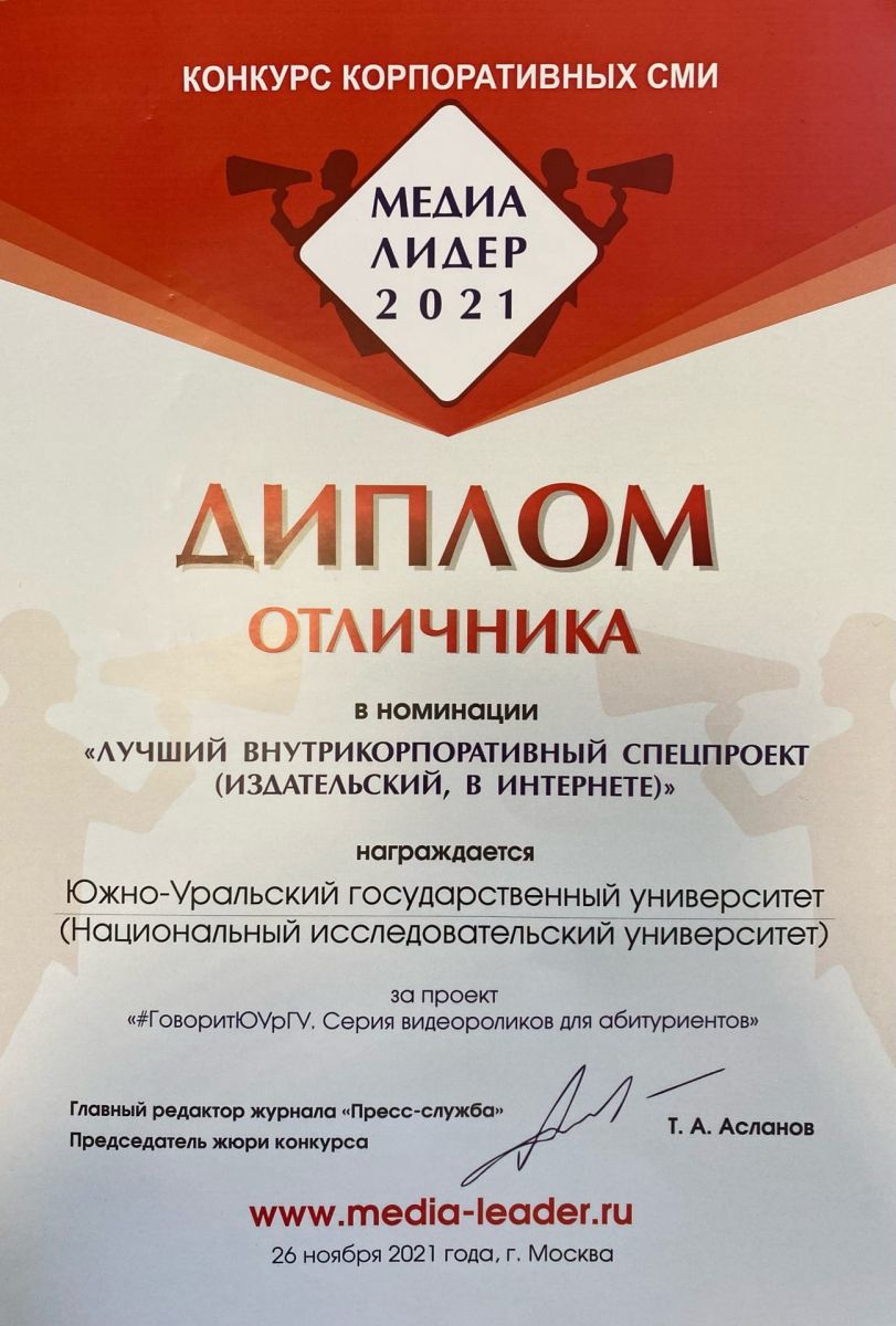 В этом году в номинации «Лучший внутрикорпоративный спецпроект (издательский, в Интернете)» отличником конкурса стал проект «#ГоворитЮУрГУ. Серия видеороликов для абитуриентов», который Управление медиакоммуникаций и мониторинга реализовывало в ходе приемной кампании – 2021. #ГоворитЮУрГУ – это серия тематических видеороликов, призванная познакомить абитуриентов и первокурсников Южно-Уральского государственного университета со структурой вуза, помочь им сделать выбор в пользу той или иной специальности, держать в курсе хода приемной кампании в университете и вести их с момента подачи документов до получения студенческого билета.